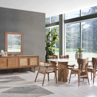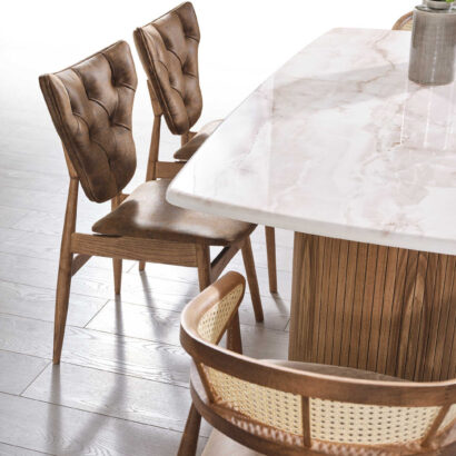 - Kombinacija mramora i drveta: Stol u Hazeran Setu izrađen je od visokokvalitetnog mramora i drveta, osiguravajući dugotrajnu upotrebu i eleganciju koja će se istaknuti u svakom prostoru.