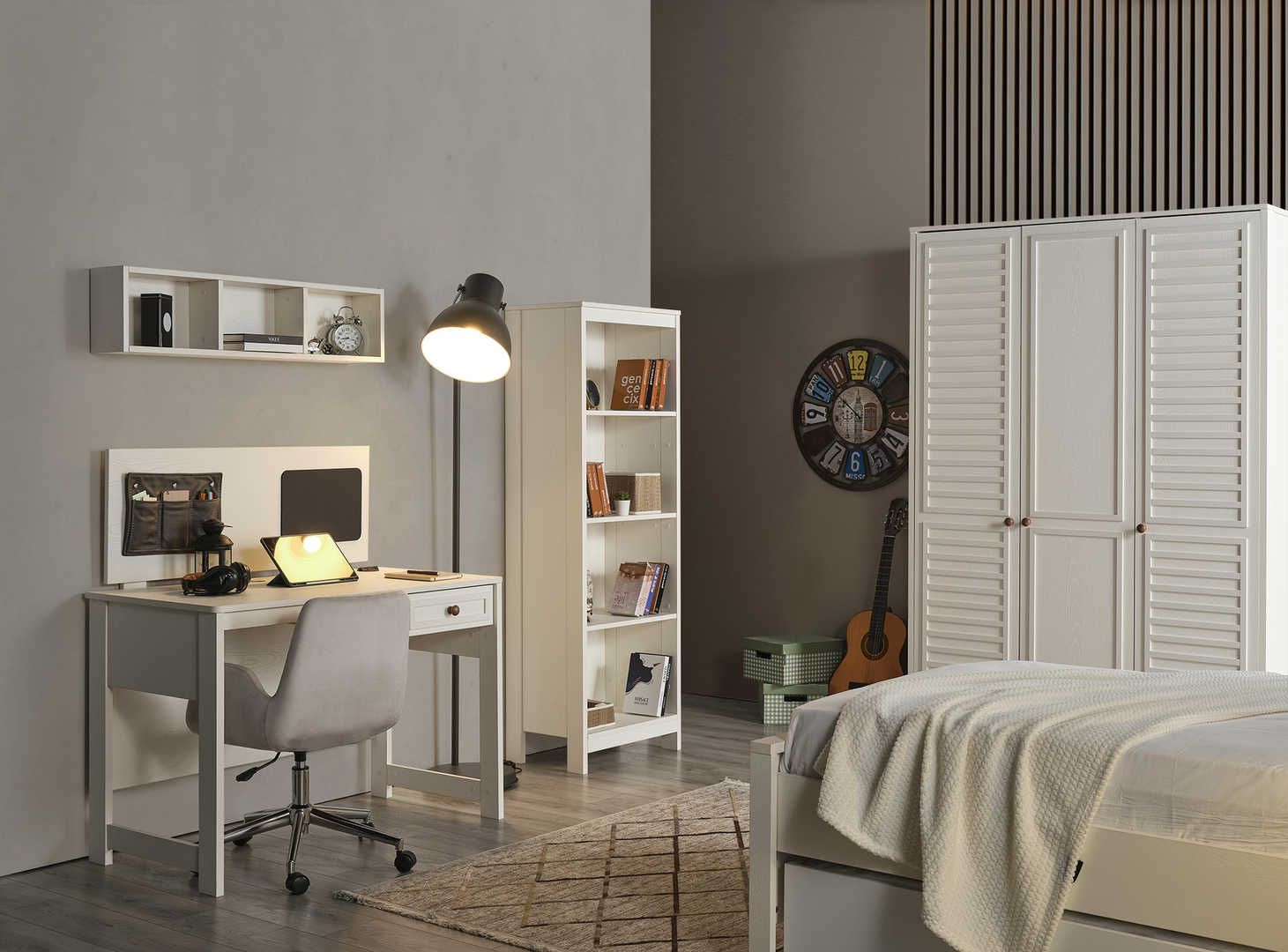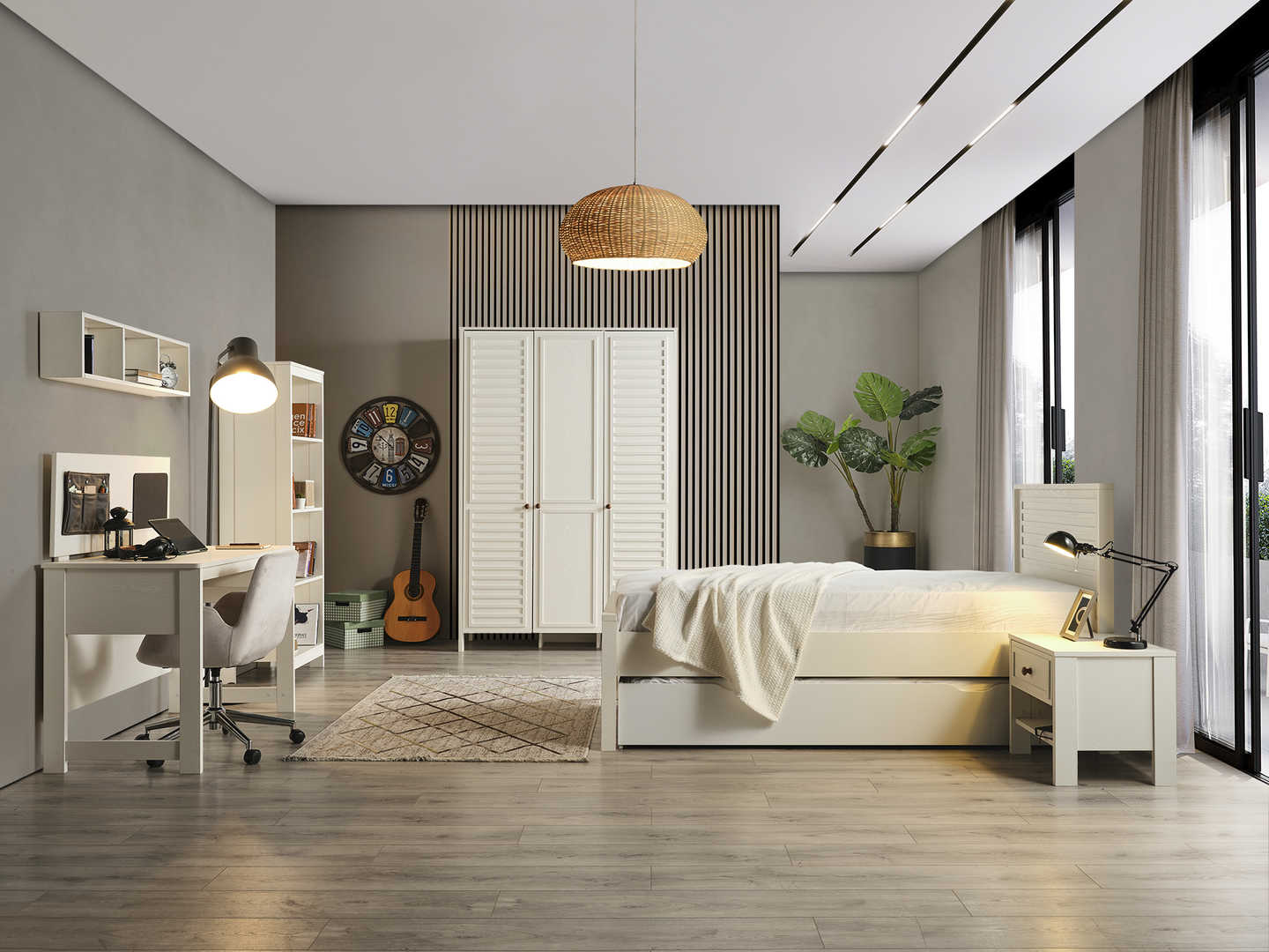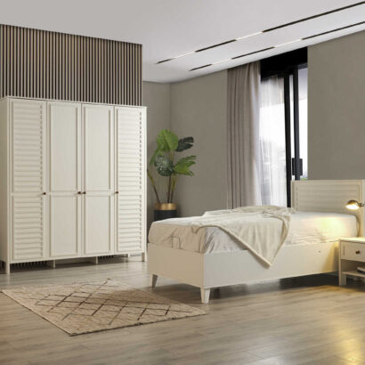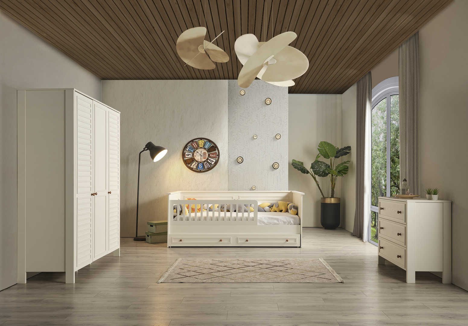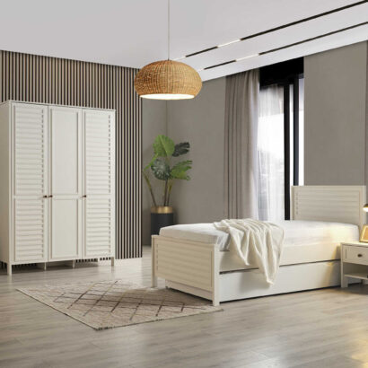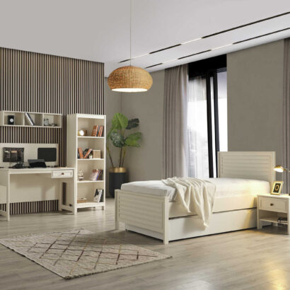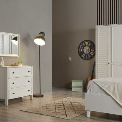 Dječija soba je idealno mjesto za vaše mališane, a ova soba za boravak, igru i spavanje će im pružiti savršeno okruženje! Sastoji se od udobnog dječijeg kreveta, prostranog ormara za sve igračke i odjeću, police za knjige kako bi imali sve omiljene priče na dohvat ruke, te simpatičnog noćnog ormarića. Ukrasena je detaljima prilagođenim za uzrast djeteta, a bjelina i boje pružaju osjećaj topline i udobnosti. Soba je dizajnirana za udobnost, igru, učenje i odmor, pružajući mališanima prostor u kojem će se osjećati sigurno i sretno. Dajte svojoj djeci sobu iz snova i omogućite im prostor u kojem će moći rasti, igrati se i odmarati bez briga! Vaši mališani će obožavati svoju novu sobu!