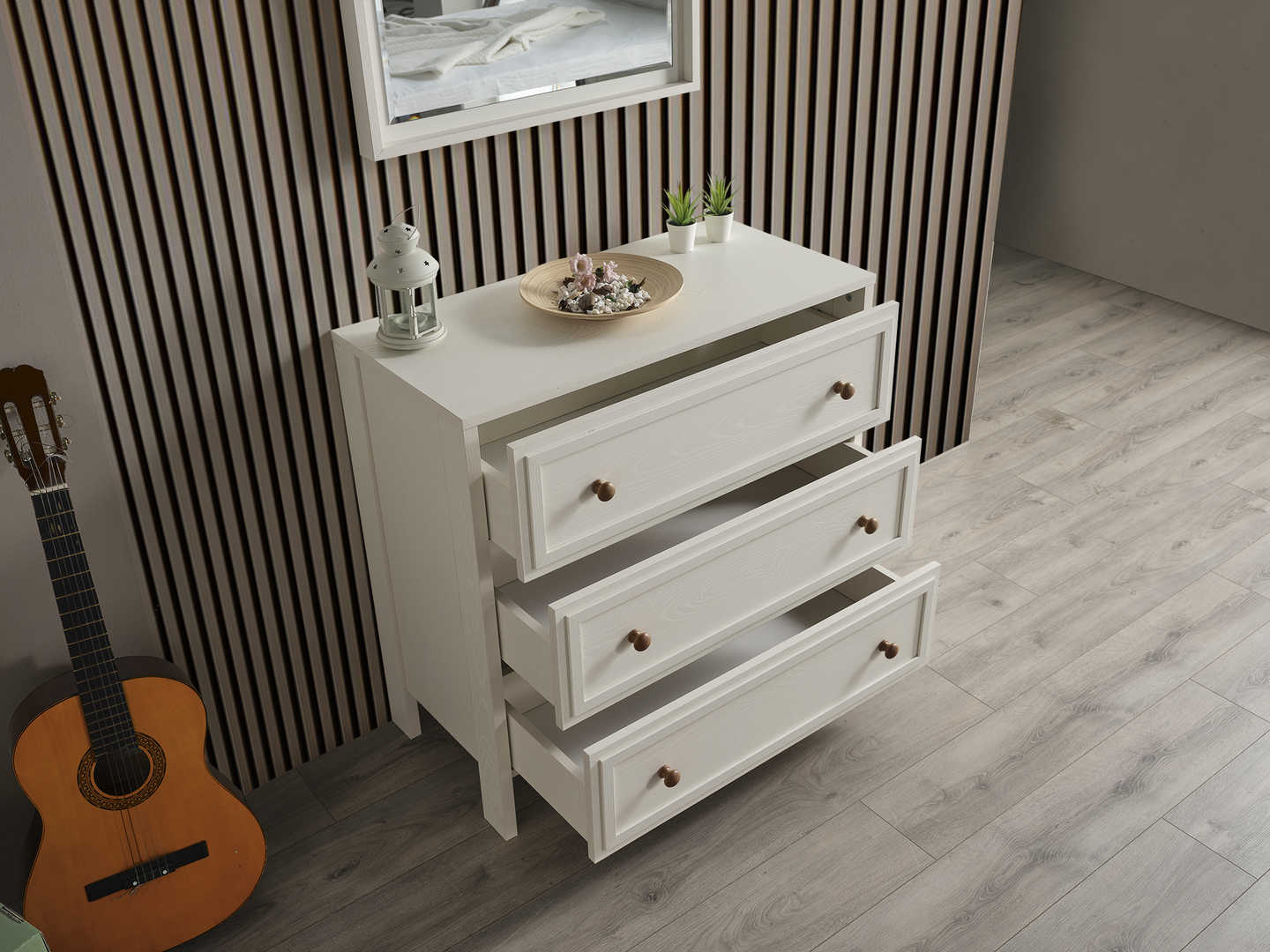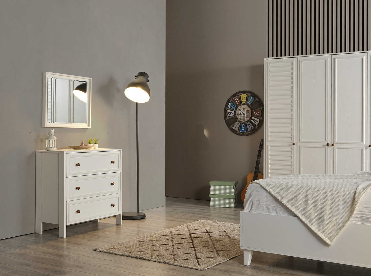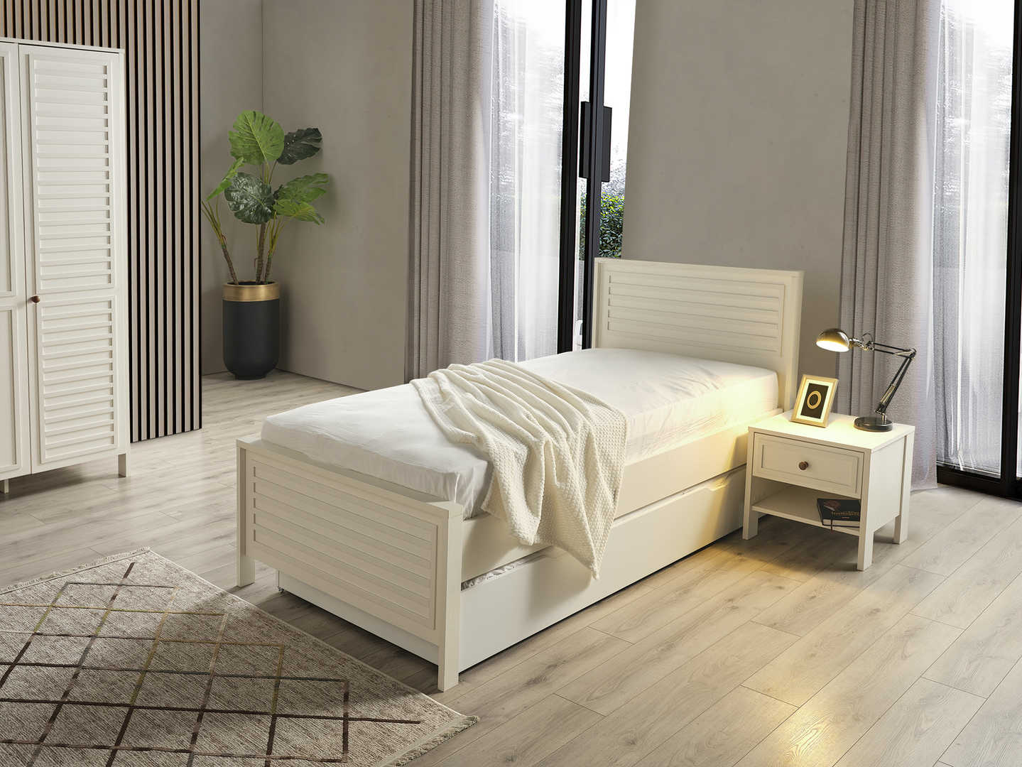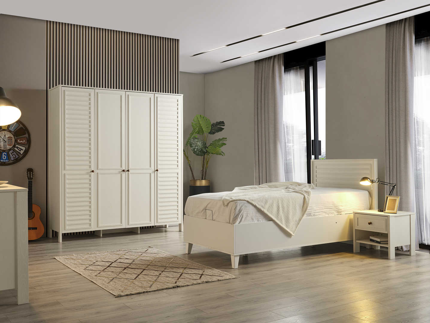 Dječija soba je idealno mjesto za vaše mališane, a ova soba za boravak, igru i spavanje će im pružiti savršeno okruženje! Sastoji se od udobnog dječijeg kreveta, prostranog ormara za sve igračke i odjeću, police za knjige kako bi imali sve omiljene priče na dohvat ruke, te simpatičnog noćnog ormarića. Ukrasena je detaljima prilagođenim za uzrast djeteta, a bjelina i boje pružaju osjećaj topline i udobnosti. Soba je dizajnirana za udobnost, igru, učenje i odmor, pružajući mališanima prostor u kojem će se osjećati sigurno i sretno. Dajte svojoj djeci sobu iz snova i omogućite im prostor u kojem će moći rasti, igrati se i odmarati bez briga! Vaši mališani će obožavati svoju novu sobu!