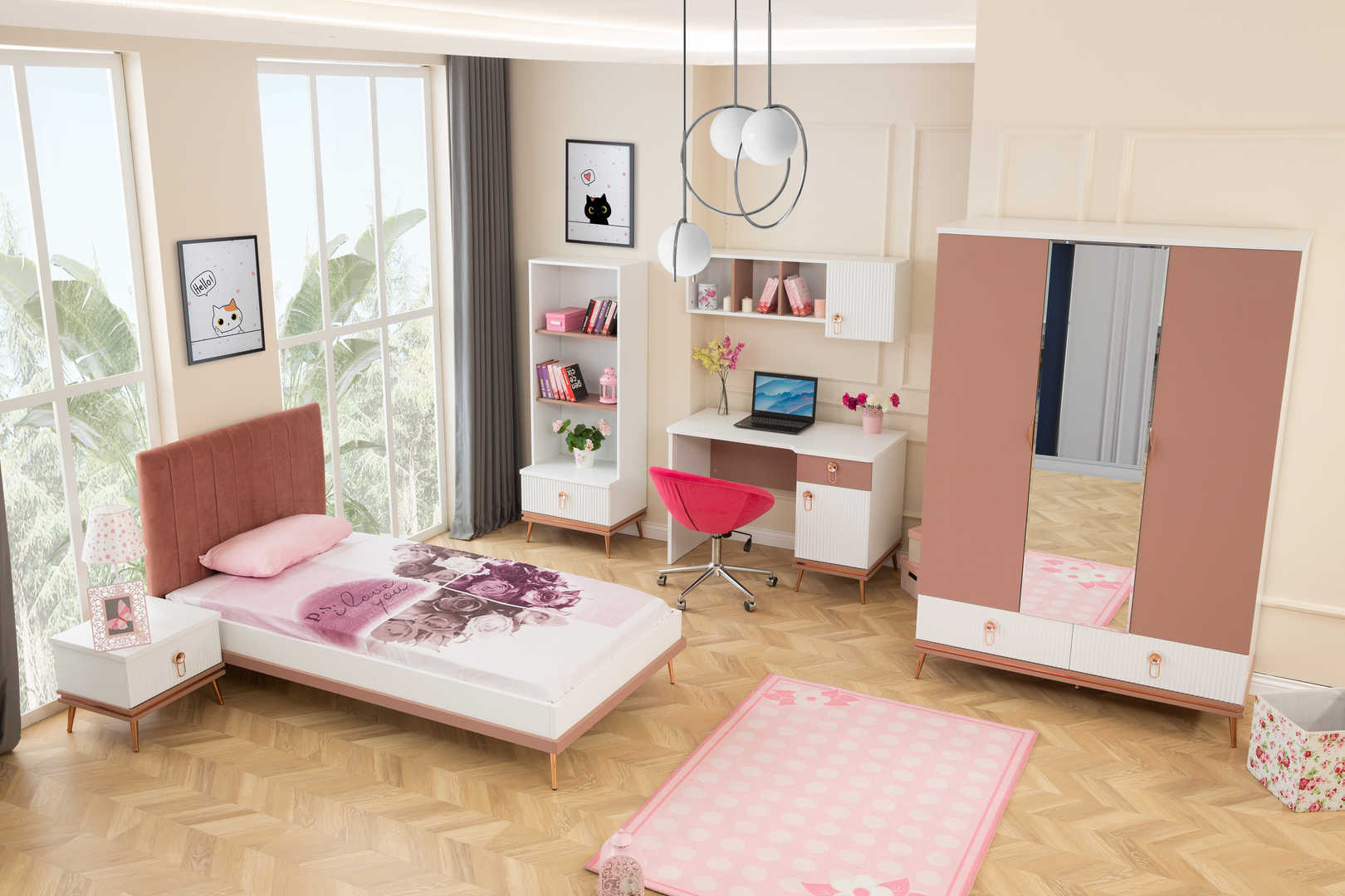 Dječija soba je idealno mjesto za vaše mališane, a ova soba za boravak, igru i spavanje će im pružiti savršeno okruženje! Sastoji se od udobnog dječijeg kreveta, prostranog ormara za sve igračke i odjeću, police za knjige kako bi imali sve omiljene priče na dohvat ruke, te simpatičnog noćnog ormarića. Ukrasena je detaljima prilagođenim za uzrast djeteta, a bjelina i boje pružaju osjećaj topline i udobnosti. Soba je dizajnirana za udobnost, igru, učenje i odmor, pružajući mališanima prostor u kojem će se osjećati sigurno i sretno. Dajte svojoj djeci sobu iz snova i omogućite im prostor u kojem će moći rasti, igrati se i odmarati bez briga! Vaši mališani će obožavati svoju novu sobu!